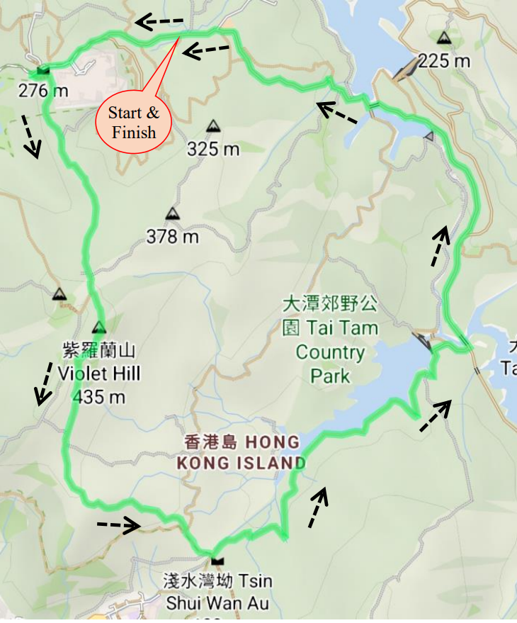 Violet Hill → Tze Kong Bridge (Tsin Shui Wan Au) → Tai Tam Tuk Reservoir → Tai Tam Tuk Reservoir Barbecue Area Site 4 →