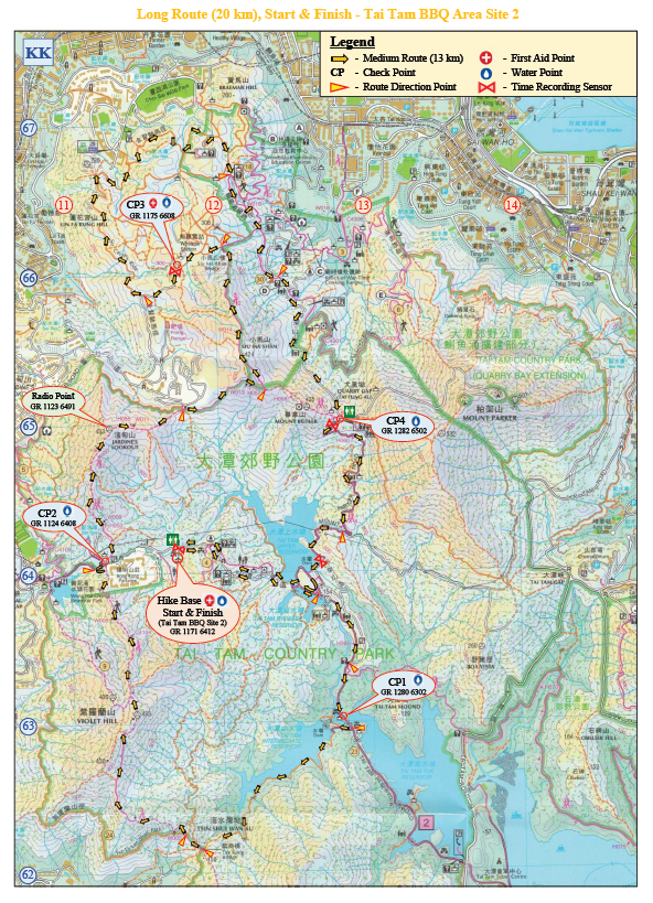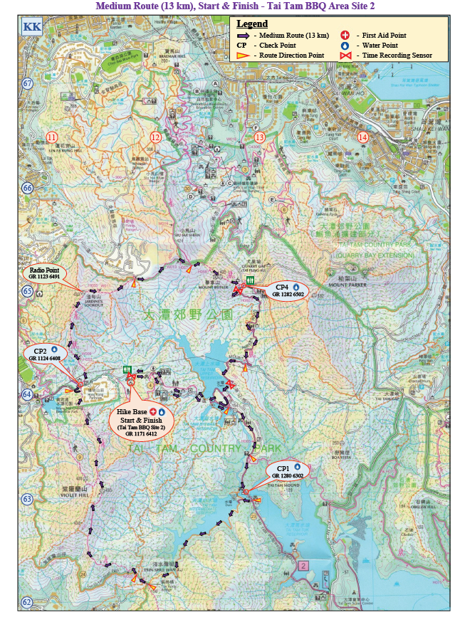 Tai Tam Country Park Barbecue Area Site 2 (Start) → Tai Tam Reservoir Road → Tam Byewash Reservoir → Tai Tam Tuk Reservoir BBQ Area Site 4 → Tai Tam Intermediate Reservoir → Tze Kong Bridge (Tsin Shui Wan Au) → Wilson Trail Section 1 → Violet Hill → Wilson Trail Section 2/Hong Kong Trail Section 5 → Jardine's Lookout → Distance Post H056/W012 → Wilson Trail Section 2/Hong Kong Trail Section 5 → Wilson Trail Section 2 → Siu Ma Shan → Siu Ma Shan Bridge → Mount Butler High Frequency Radio Receiving Station → Sir Cecil’s Ride → Lo Fung Au → Sir Cecil’s Ride Stream Rest Area → Po Luen Path → Sir Cecil’s Ride → Mount Parker Road → Quarry Gap (Tai Fung Au) → Mount Parker Road → Tai Tam Upper Reservoir Dam → Tai Tam Reservoir Road (towards Wong Nai Chung Gap Road) → Tai Tam Country Park Barbecue Area Site 2 (Finish)